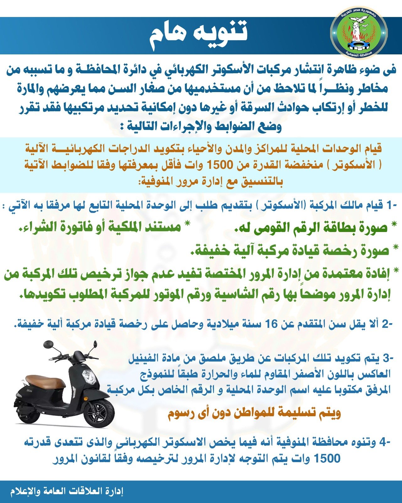 ومن جانبه وجه محافظ المنوفية ، إدارة مرور المنوفية بالتواجد الميداني وتكثيف شن الحملات المرورية والتنسيق مع الوحدات المحلية ، لمتابعة الالتزام الكامل فيما يخص الضوابط المحددة للاسكوتر الكهربائى ،ومتابعة كافة المسارات المحددة لمركبات التوك توك وعدم زيادة التعريفة المقررة لمنع استغلال المواطنين.