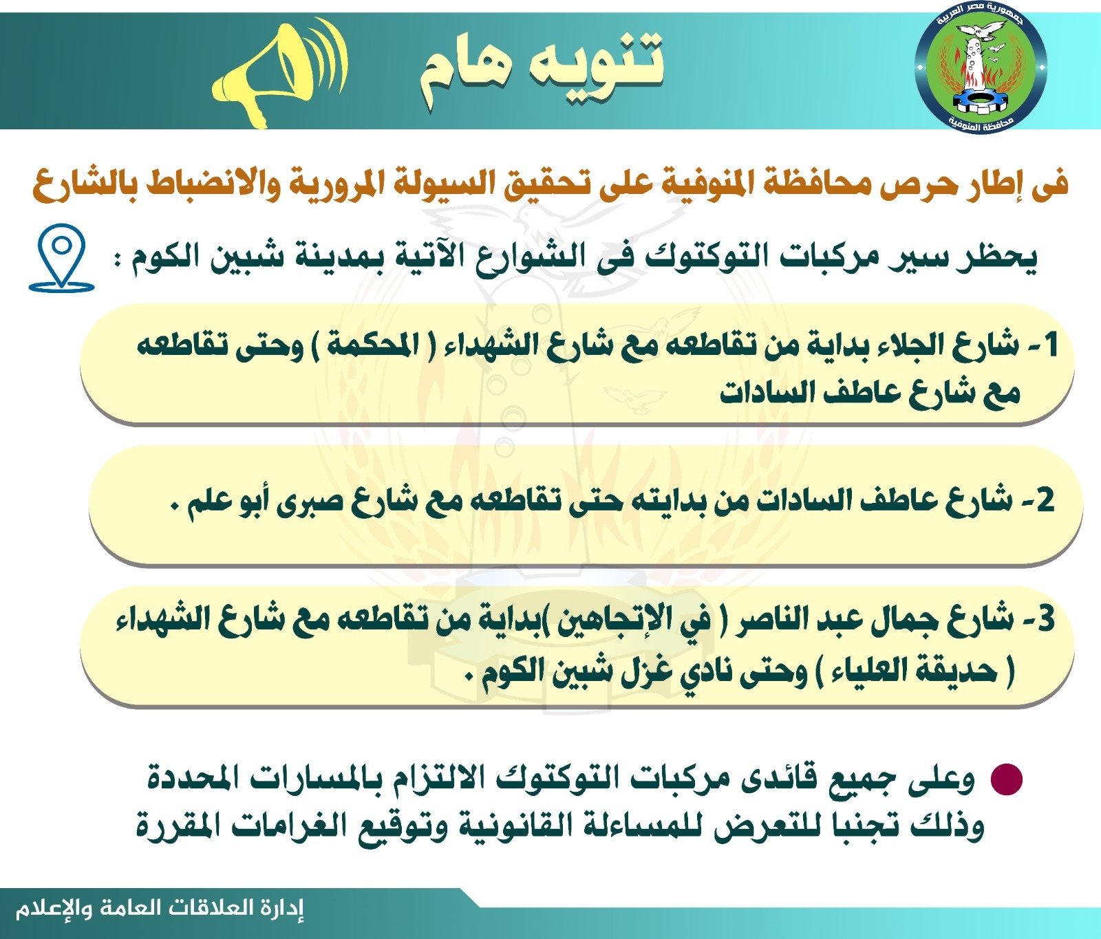 كما ناقش محافظ المنوفية، الموقف الخاص بتنظيم حركة سير مركبات التوك توك داخل مدينة شبين الكوم ، وذلك في إطار جهود المحافظة المستمرة لتحقيق الإنضباط المروري وتنظيم الحركة تيسيراً على المواطنين ،حيث تم استصدار قرار بتحديد بعض الشوارع كمرحلة أولى والتي يحظر على قائدي مركبات التوك توك السير بها وهم ( شارع الجلاء بداية من تقاطعه مع شارع الشهداء ” المحكمة ” وحتى تقاطعه مع شارع عاطف السادات – شارع عاطف السادات من بدايته حتى تقاطعه مع شارع صبري أبو علم – شارع جمال عبدالناصر ” فى الاتجاهين” بداية من تقاطعه مع شارع الشهداء “حديقة العلياء ” وحتى نادى غزل شبين الكوم، وفى حالة عدم الالتزام سيتم توقيع غرامة على المخالفين.